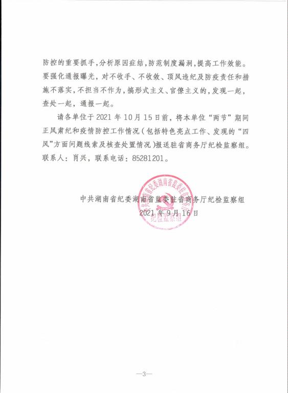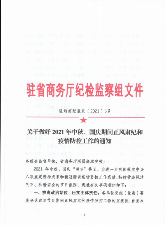 转发驻省商务厅纪检监察组《关于做好2021年中秋、国庆期间政风肃纪工作和疫情防控工作的通知》